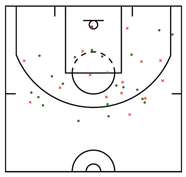 In what would be the second-highest scoring game of his career, Bryant was efficient, shooting 23-of-39 from the field, 8-of-12 from the three-point line, and 11-of-12 from the free-throw line while nearly playing the entire game.