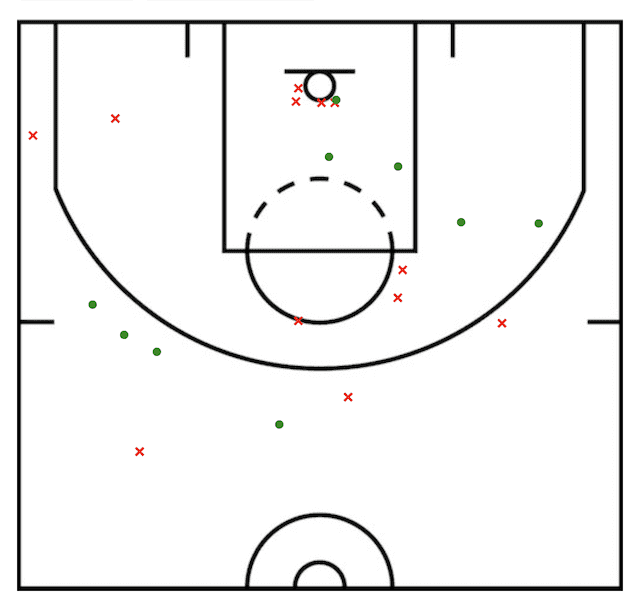 In what would become a game between the present and future of the league, Bryant recorded 34 points (9-of-21 from the field and 12-of-16 from the free throw line), five rebounds, and four assists while playing every minute.